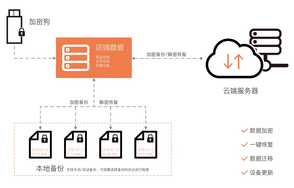 科特收银软件采用加密狗加密认证,更换设备后只要插上加密狗便可继续使用科特收银软件。采用本地和云端双重备份策略,有效保障您的数据安全,即使您的电脑损坏或者丢失,数据仍安然无恙。